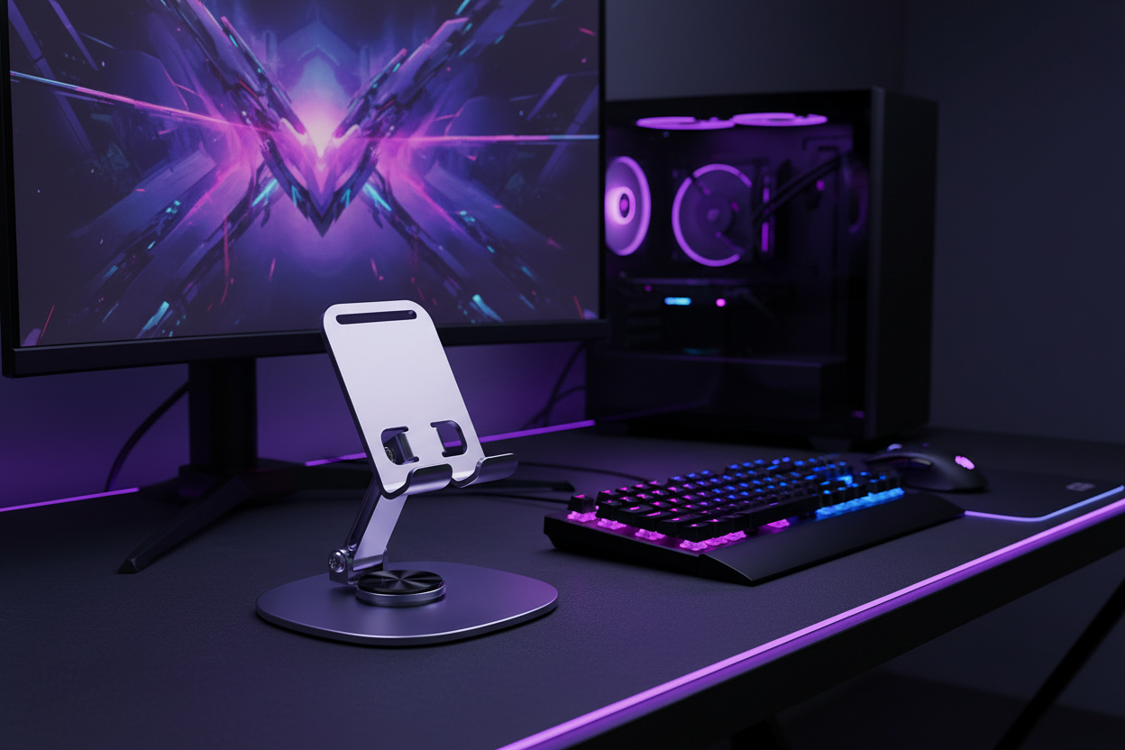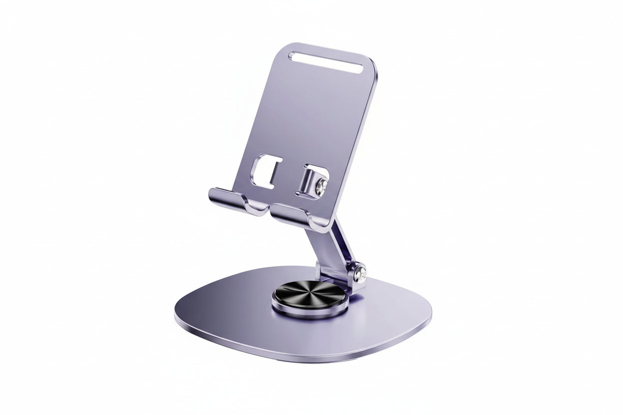 Support de bureau universel rotatif 360° pour smartphone et tablette, conçu pour le travail, le gaming et le divertissement. Idéal pour les réunions vidéo, le streaming, le gaming mobile ou le visionnage de films en mains libres.